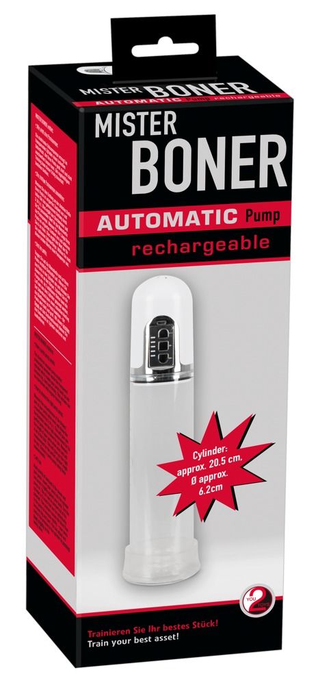 Прозрачная автоматическая вакуумная помпа для пениса с серебристой панелью управления с 3 кнопками. Помпа также имеет измерительную шкалу в сантиметрах и дюймах. Перезаряжается с помощью прилагаемого USB-кабеля. Рабочая длина - 20 см.