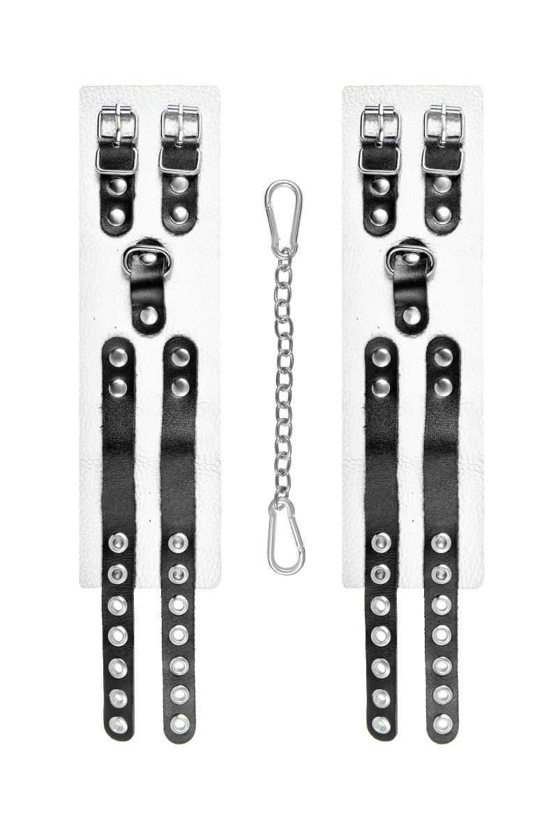 Мягкие оковы с двумя жёсткими ремешками от Pecado помогут обездвижить партнера во время сексуальных прелюдий или жестких БДСМ-играх. Оковы изготовлены полностью из белой, натуральной кожи. Ремешки выполнены из чёрной жёсткой кожи, украшены люверсами. Выделка материала произведена вручную. Ремешки и широкая манжета хорошо держат форму: не тянутся и не мнутся. Качественная металлическая фурнитура добавляет лоска изделию, а аромат натуральной кожи повышает градус возбуждения. Благодаря широкому запасу регулировок, можно подобрать необходимый обхват. Аксессуар удобно застегивать и легко расстегивать. При правильном использовании не оставляет следов на теле и не доставляет дискомфорта. Манжеты оков соединяются между собой помощью двух карабинов и съемной стальной цепочки. Подходит и для женских, и для мужских ног. Длина манжет - 25 см, ширина - 7 см. Длина сцепки - 20 см.