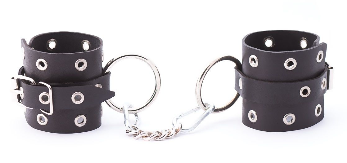 Кожаные однослойные наручники с люверсами. Наручники имеют кольца для крепления и металлическую сцепку. Ширина манжет - 6,5 см. Длина манжет - 20 см.